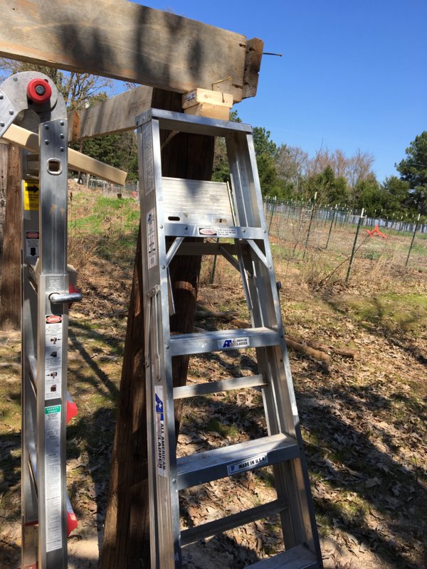 Today I put up 2x8’s on the sides, at the top. I had 8’ 2x4’s and cut off pieces, so I cobbled them together and made my rafters. Once again I used 2 ladders to hold up the boards.