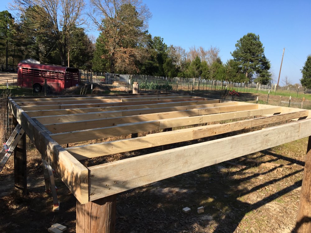I got all my scrappy rafters made and put up. I’m tired. Tomorrow I’ll deck it, cover with tar paper and put tin on it. I climbed a ladder to snap a pic of the top.