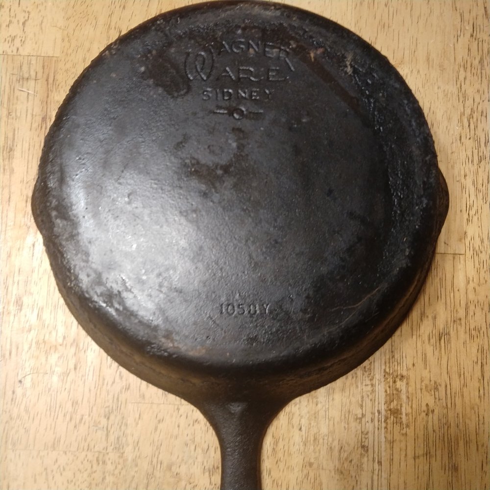 It's a Wagner Ware made in Sydney. It's very light weight seems cheap compared to lodge. As you can see it most definitely needs to be heated up in a camp fire, than cleaned and oiled with olive oil. It may survive being heated in a camp fire or maybe it won't because it's so thin. But I'll give it a try next time I have a camp fire.
