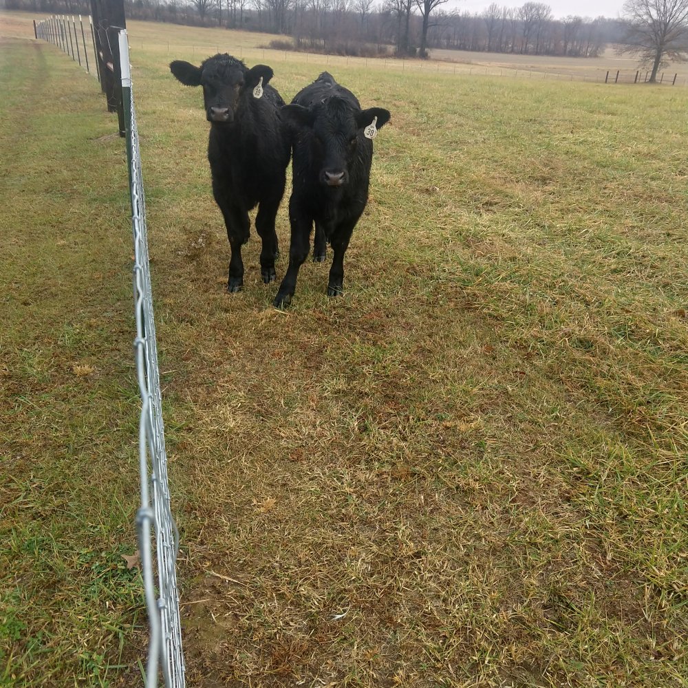 Poured down the rain today. After the rain my wife and I went out to mess around a bit with the steers. We took some sweetfeed in a large coffee can. My wife said "hey boys" and they lifted their heads off the ground. They still had grass hanging out of their mouths.