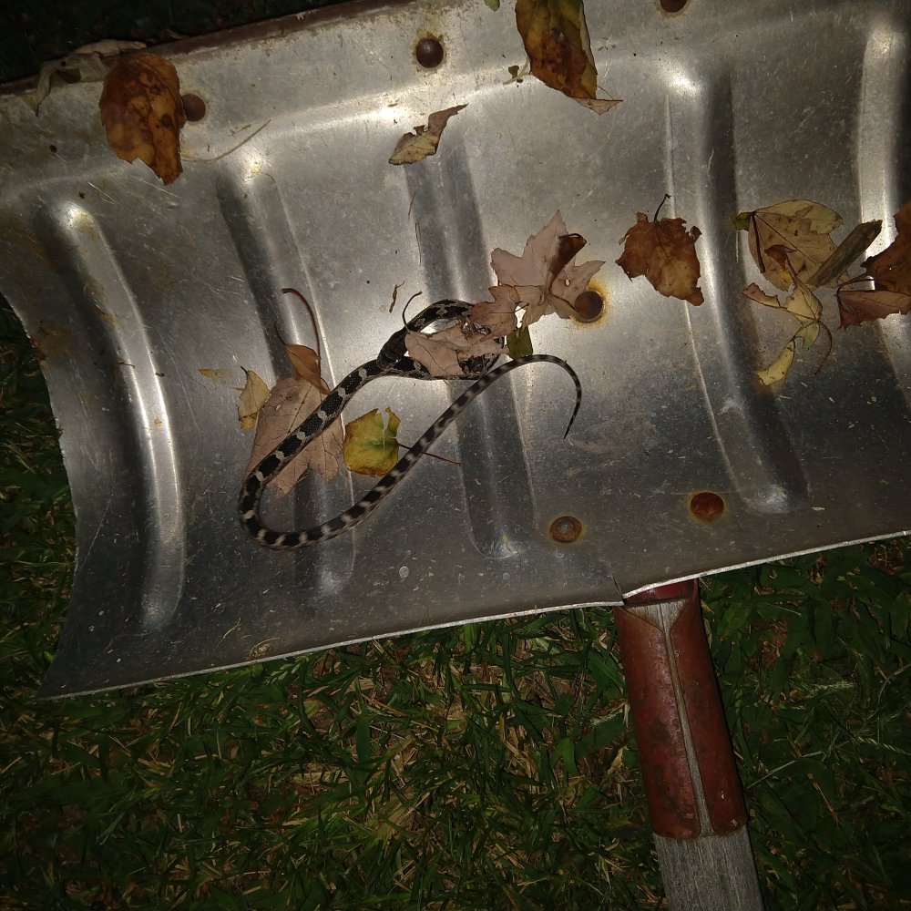 I'm no snake expert, but I'm pretty sure It was a juvenile king snake (good snake). That was looking for a place to hibernate. Ofcourse our cement patio right next to the house foundation is the ideal spot. Snake like to hibernate in rocks. I do know for sure it wasn't a viper. So I put it on my snake/snow shovel and threw it in the ditch across the road, to live another day and find somewhere else to hibernate.