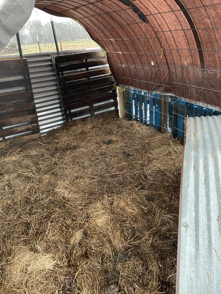 This is a cow panel hoop shelter. It works well, unless the entire farm is saturated, standing(running) water. It’s deep bedded, as all the shelters are, but is still wet.