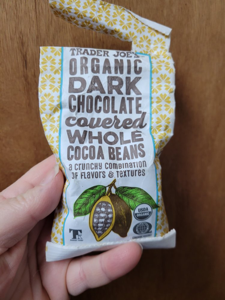 Am I reading right? Chocolate covered cocoa beans? That's a double chocolate dosis,lolI like to eat cocoa nibs mixed with dried mulberries. Don't need other sugars than that with it if eaten like that.