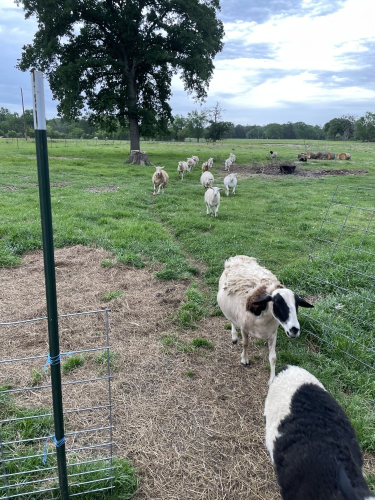 Called ewes and lambs in for feed this evening before the storm hit. Ewenique, 9 year old ewe, led the charge. That’s her 3 month old black ewe lamb behind her.