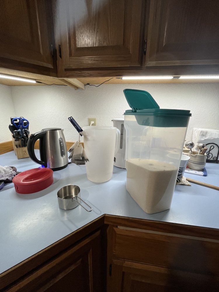 View attachment 23875 pour the hot water over the sugar and tea bags and I am boiling another pot, I'll fill the pitcher and use some of the hot water to use up whats left in my honey jar,- I use the honey water to feed the kombucha jug we are currently drinking,