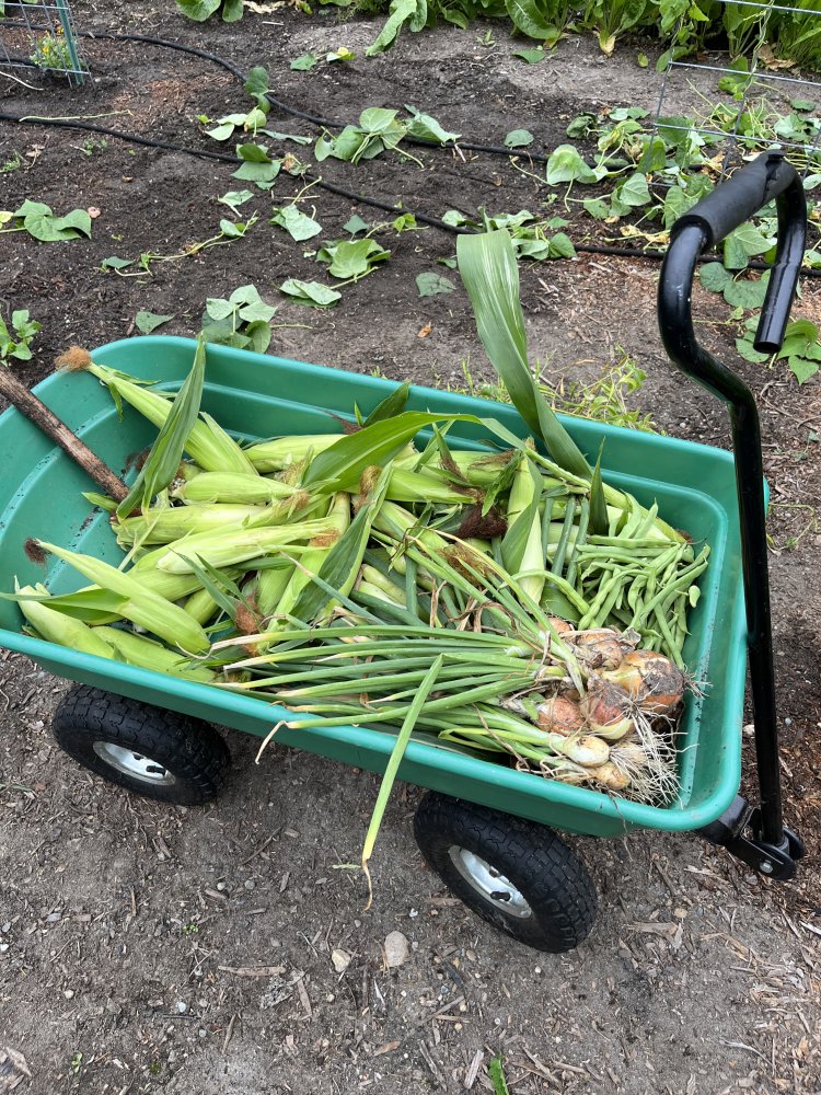 got the corn and green beans pulled up and some onions, pulled the wagon to the porch,, talked to DD#4 on the phone,,, it started raining, ,, raked up the garden bed , pulled up the fence posts that healed up the pea and green bean trellis up, raked some more----and it and noticed I didnt have my glasses?????????