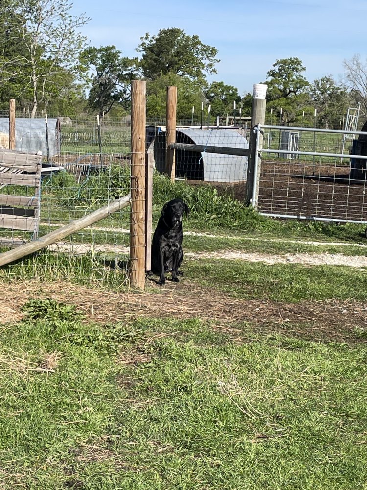This is Carson, half Labrador and half Great Dane. It’s a great cross and he’s my second one. In this picture I was working in the front field that “belongs” to the Anatolians. Even with them not being in the field, I make him respect “their” space. I told him he couldn’t come in.