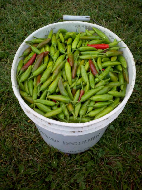 This is some of what I picked off this one plant. Yes that a 5 gallon bucket full and a quart canning jar box.