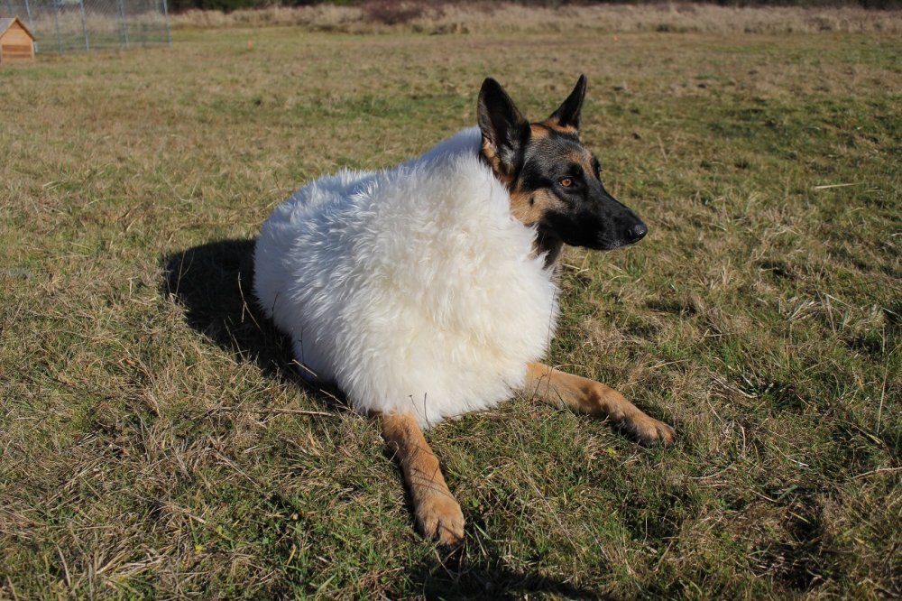 The dog looks so fashionable.And my wolf in sheep's clothing, Athena