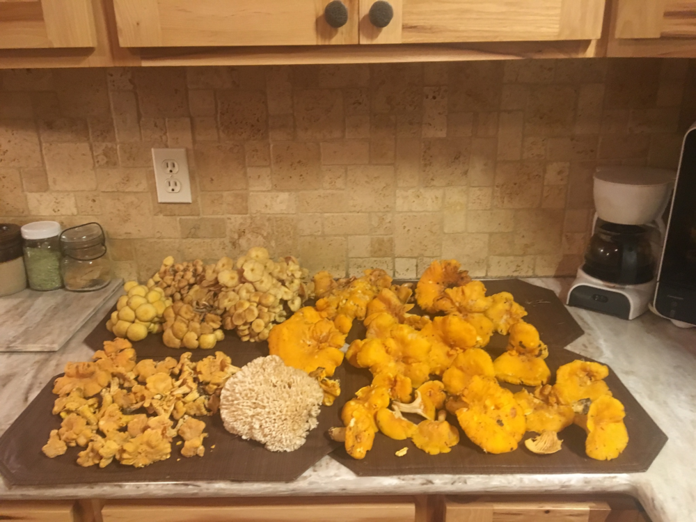 upper left honey mushrooms lower left and right two different varieties of chaterelle and the middle coral mushrooms.SCORE! That is a good haulWhat are they all? One looks familiar, but I'm not going to hazard guessing lol