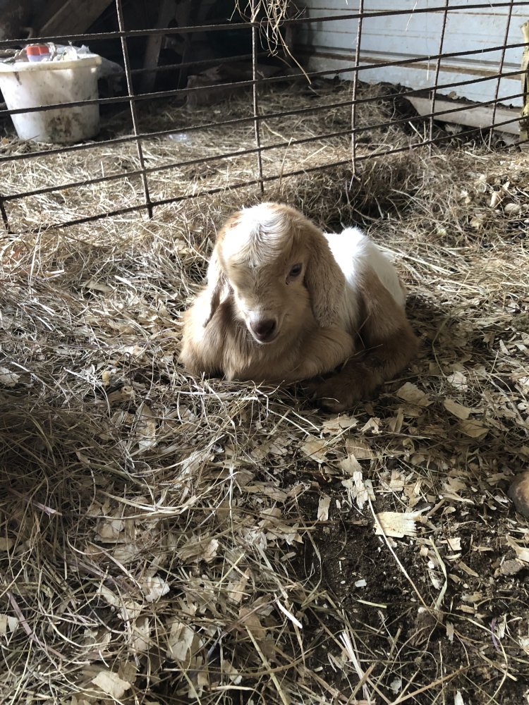 That's Luna - a Kinder. I have another Kinder that's black with moon spots and Cameo the Nubian that's more of a dapple. Love her pattern! One of Luna's babies has very faint gray moon spots on a white body. She's in the middle of the tire with a dark spot on her withers and you can sorta see the gray spots. She's pretty!