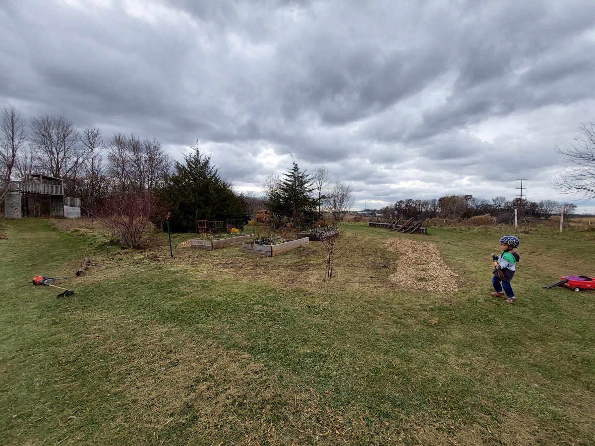 It was just (the last few buckets were stretched) enough to mulch my raised bed area. I plan on adding two more to here next year, but I need some help in the weed control realm.