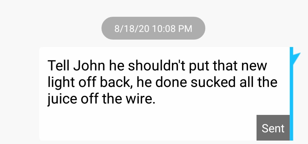 You know instead of texting me back, he waits in the pitch black for me to come out with my flash light. I hear John holler from across the road. "Jeff?" I holler back Yes John. then he hollers back, not the new light, transformer blew at the sub-station. Brother's son and grandson are working on it now, won't have power until in the morning. You all-right? Need anything? I holler back thanks for the info, we're good. He hollers back, OK then, goodnight see you in the morning. I holler back, yep Goodnite, holler if you all need anything. He hollers back, will do.