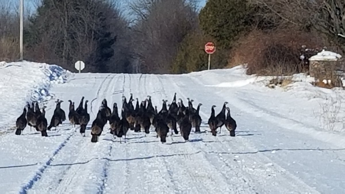 We have groups of turkey like that here. Not unusual to see 20-30 at a time. Fortunately we have had no snow beyond a one shot light hit...gone in 24 hours. But I still have plenty of birds feeding...scratch, horse and goat droppings. Knowing how many are out there, makes me wonder why Mr Fox prefers my hens! :( :mad: