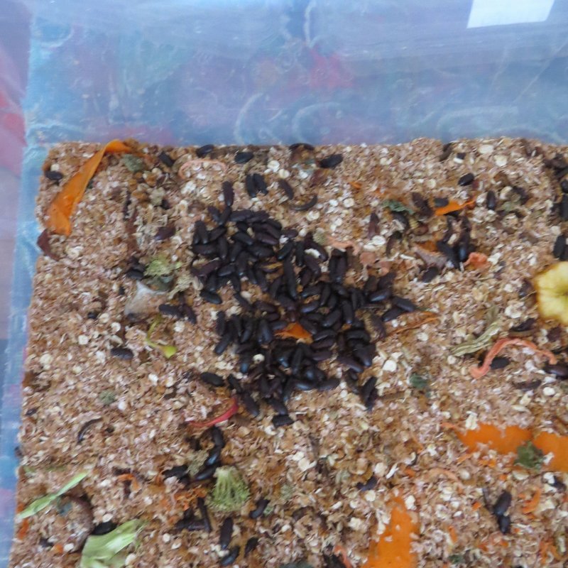 This pic was from the early stages. I feed way less vegetables at a time now, to reduce waste. The white pieces of cardboard is for the beetles.