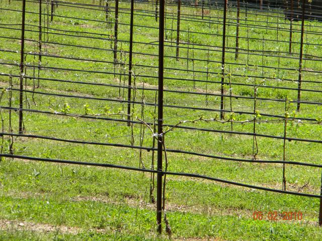 Wow! Okay, so now I have some questions. What kind of wire do you have them growing along? I have some pretty heavy gauge plastic coated wire that I was going to use that I think will work. Also, what is the spacing between the height of the wires? It looks like maybe 18" and 3'? What are the brown tubes that it looks like the grapes are coming up out of?