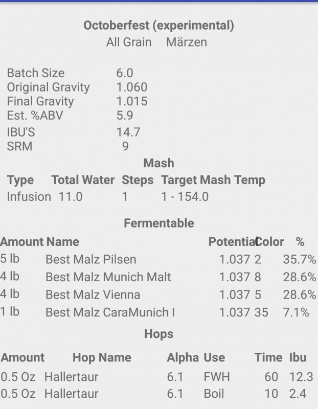 Next up is an experimental all grain Oktoberfest with all grown in or around Munich Germany ingredients. I developed this recipe myself, so copy/brew it with fair warning, it's strictly experimental. Of course any development help would be gladly welcomed.