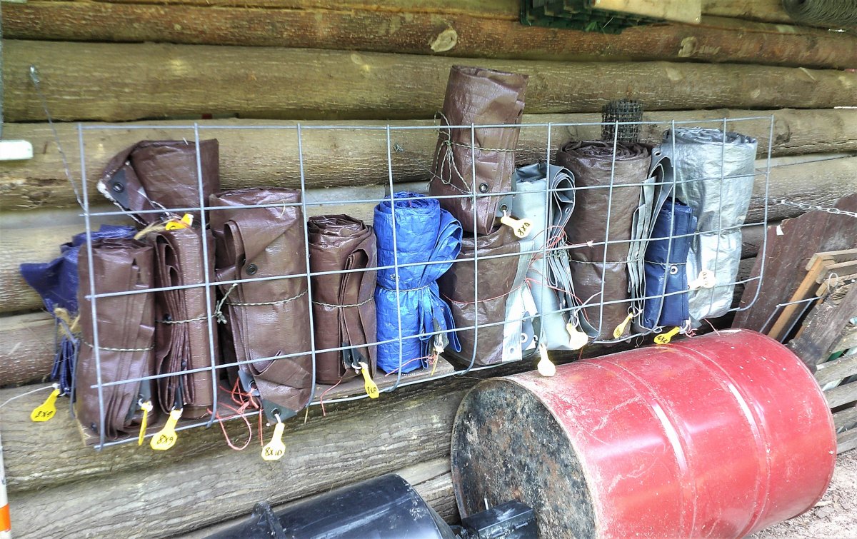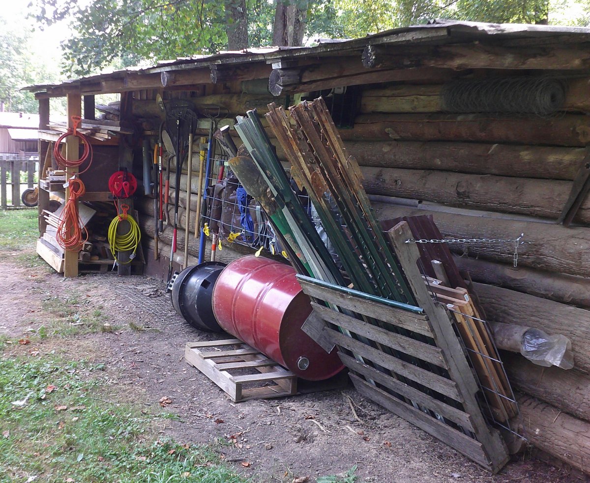 Got T post storage complete, which also created a space to store smaller flat items in behind it, such as pieces of cattle panel, plastic trellis, rolls of plastic mesh, etc. The T post storage worked so well! It also holds my tamping bars, post hole diggers and metal track/strips I'll be using for other projects.