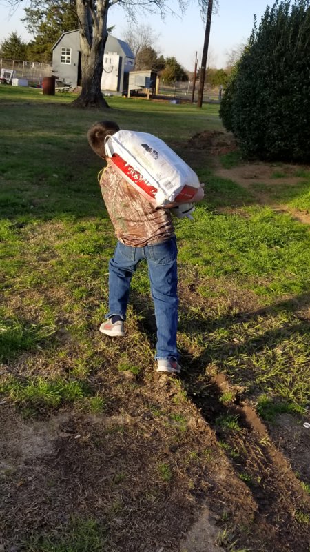 this is my eldest son. While most 10 year olds are playing video games he's working like a man hauling 50lb bags of feed, wheelbarrows of wood chips, digging post holes, driving t posts, putting up fence, digging trenches, and tending the rabbitry. For fun he likes hunting, fishing, and camping. On the weekends he, his grandfather, and I shoot skeet. He's pretty good with a 20awg shotgun.