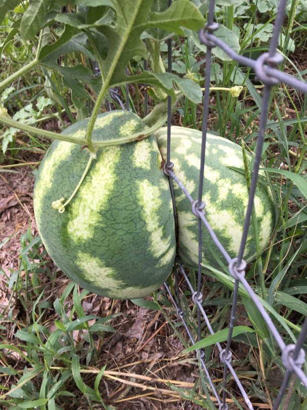 Love this pictureThis is a yellow meat watermelon that is growing in the fence. Looks like a striped green butt. LOL