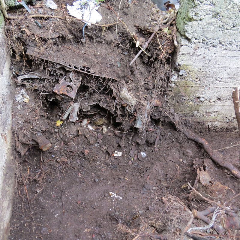 Done. Except for the tree stump, roots and whatever is under there that I didn't get out, or couldn't get out yet. Here is the root I cut out this morning, look at the horseshoe and stuff grown into it. It's kinda cool… There are loads more stuff stuck in the tree as well, bottles, part of a bed frame…