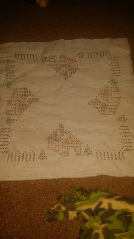 so I'm working on my quilt Stop correcting again and because I apparently cant do anything without a challenge, and the blocks got wet and some of the cross-stitch pattern bled so I have to put it in by hand. so far its only 5 blocks. ant to add to the challenge the pattern has ben discontinued and I only have enough blocks for a double quilt and want to make one to fit on a king.