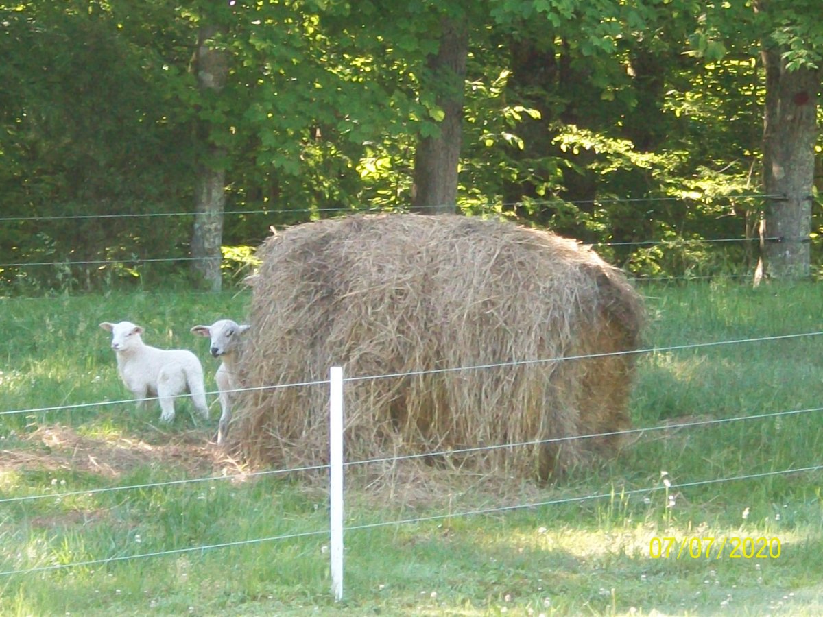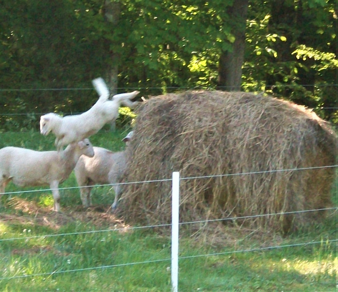 July, our 3 wk old lamb, is the only one light wt enough to jump to the top of the hay bale and she did it over and over and over as she played with the older boys. It was such a delight to watch the sheer energy and joy in that jumping up and leaping off again...and she was so quick it was hard to get pics of it all.