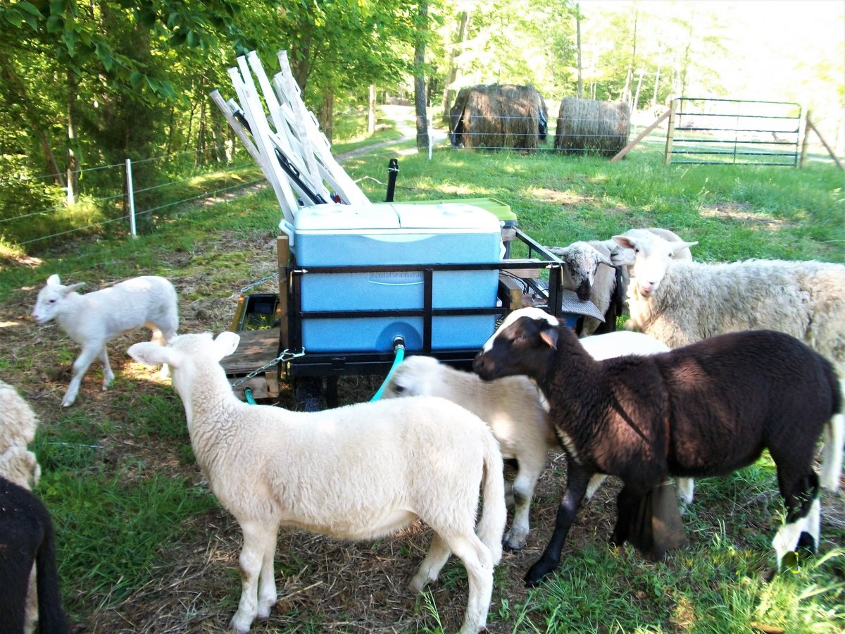Our water wagon in use. Holds the water, minerals and feeder, dog food and pans, push in stakes and wire reels, chocks for the wheels and anything else I want to toss on there at the moment. It can be pulled by hand or by mower or ATV and holds 1400 lbs if need be. I'm in LOVE with the watering system and mineral feeder....streamlined my paddock moves like crazy and also delivers MUCH more drinkable water to both dog and sheep~nice, cool and fresh as opposed to dog slobber slimy and tepid with pieces of grass and leaves in it from sheep's mouths.