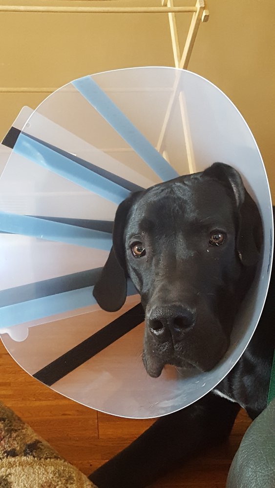 He tried waking me this morning 4x. Nope! Go lie down! After his potty walk I took his cone of for training (a.k.a. feeding him). He quit after a couple repetitions, so breakfast is over. Cone on and he is in a down-stay on his bed - as far away from me as possible.