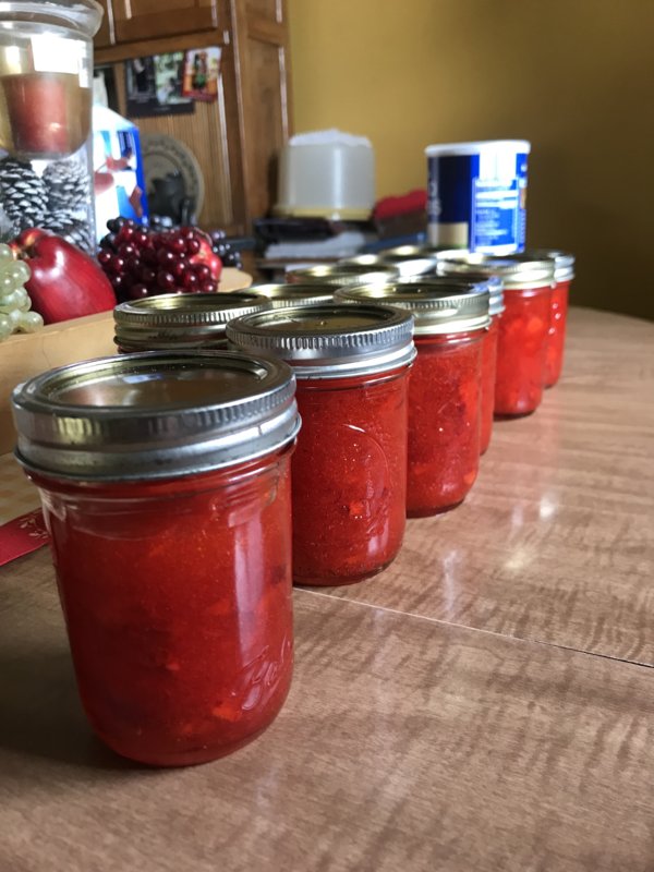 Yesterday's strawberry freezer jam. That is the third and fourth batch, and finishes up the berry crop for this year. This batch was super good!