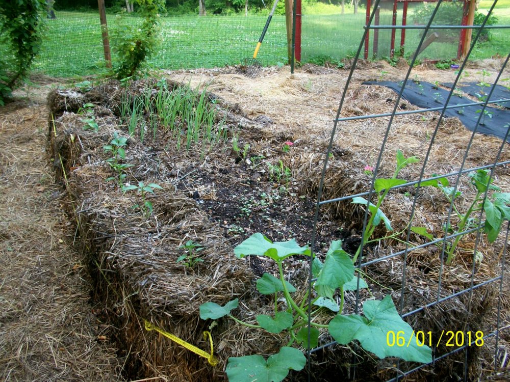 This bed has sweet onions, carrots and turnips(which need thinned), but also has hot peppers planted in the bales, as well as a butternut squash and a beefsteak tomato, along with a few petunia plants.