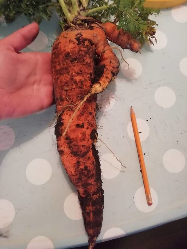 I didn't know carrots could that THAT big?!?! The others we pulled last year were wonky, some very much so, and after a few I stopped bothering with them and just left them out there... A few months and a mild winter later they've turned into bloody monsters! LOL