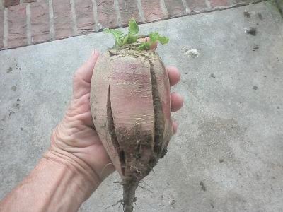 oh yeah, some radishes can get pretty big. i don't usually grow them for eating other than a few people who might eat a few here or there, but i do like the sprouts here or there, but not enough to make a huge crop of them. having left them to flower i find some that will get quite large. and then there are certain varieties which will get as big as my arm (and as long too). they are very useful for drilling holes through clay to improve drainage and to give the worms something to eat. ends up the deer will eventually eat them in the winter if there is nothing else to find. like turnips they can have some interesting smells when decomposing in the spring when the thaws come along at last. turnips smell like beer, i can't quite figure out what the radishes smell like but they're ok as long as i'm not accidentally stepping on them and getting mush in my crocs... :)
