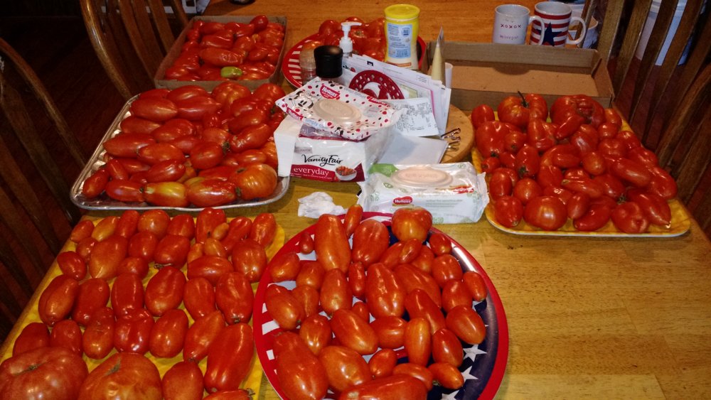 My wife says she's allergic to tomatoes. All I can say is she better get over right quick...this is picking from 2 1/2 rows.I still got 3 1/2 rows left to pick - so this isn't even 1/2 of them.