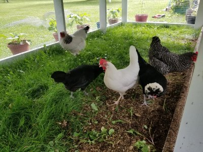 Chicken, I love chickens!!!! So nice. I just remember when we made their run. It was so green and now is so brown,lolNo garden work here but we finished up the add-on to the chicken run, the half side, and the girls love it
