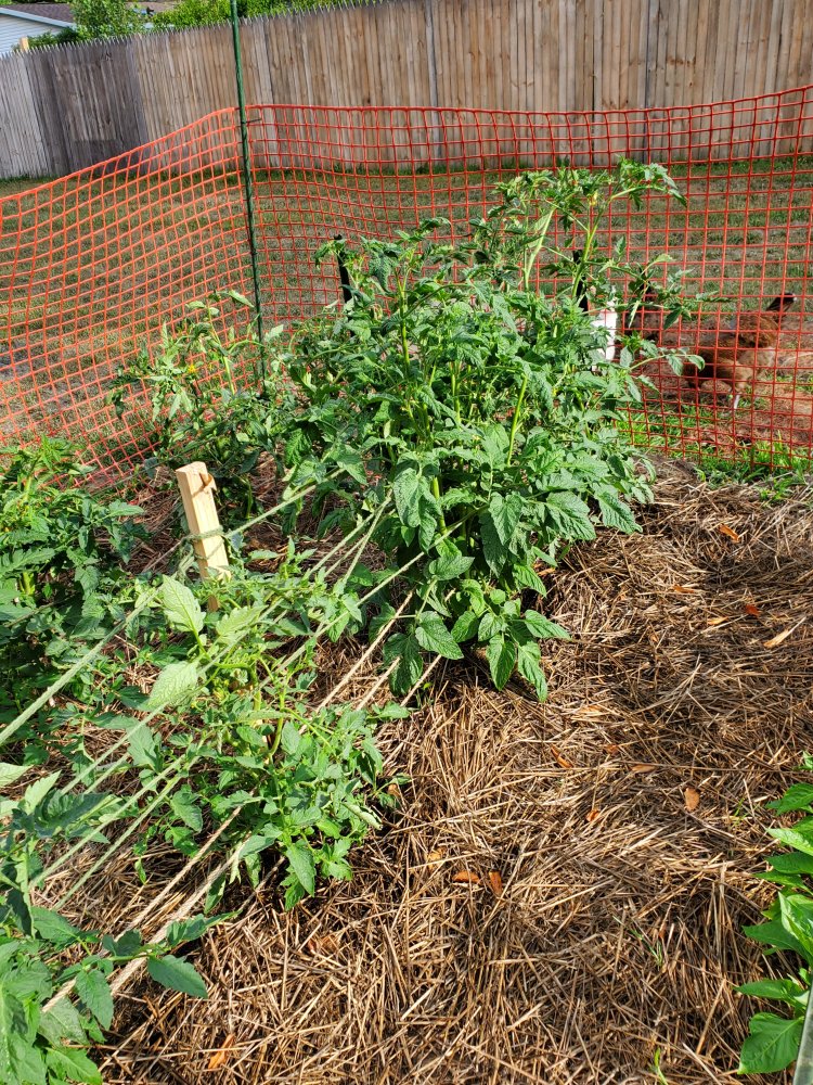 So, I watered while let the chickens out since yesterday I was gone most of the day. I think I am doing something wrong with the tomatoes. A few here and there but all green still and some of the plants are huge. Should I had trimmed them?The peppers are still going. Have no clue about the Spanish sweet onions?