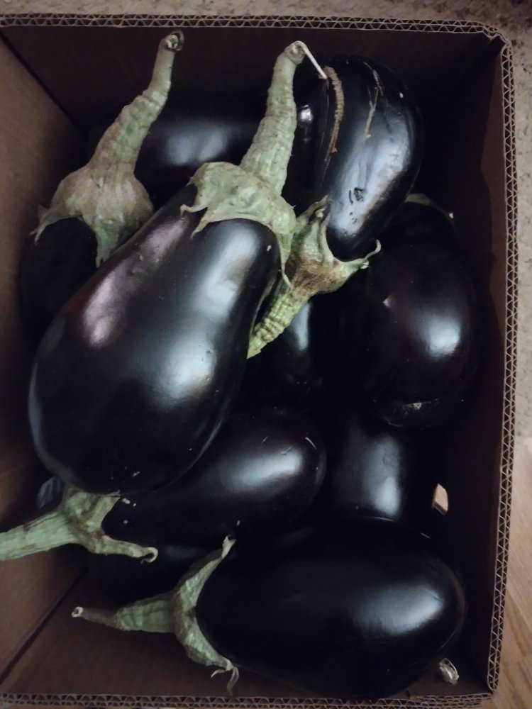 Anyway -- I got in on some rebid...4pt blueberries & 6 PT cherry tomatoes $5. Then a box of brussel sprouts & box of mixed cauliflower and broccoli $5ea box....last $4 box eggplant. Got home , weighed, smiled...17#eggplant, 8# Brussels, 27# broc/cauli. I'm pleased. Figures approx $.30 a# for veggies. My goats will get the little trimmings/clean up parts tomorrow.