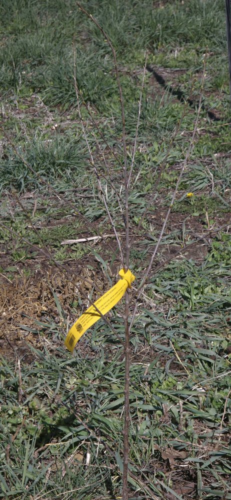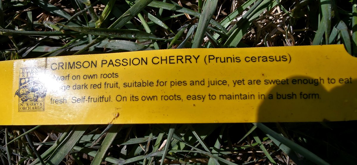 Looks like a burnt ridge nursey tag. Don't ask me how I know this.Planted a Crimson Passion cherry.