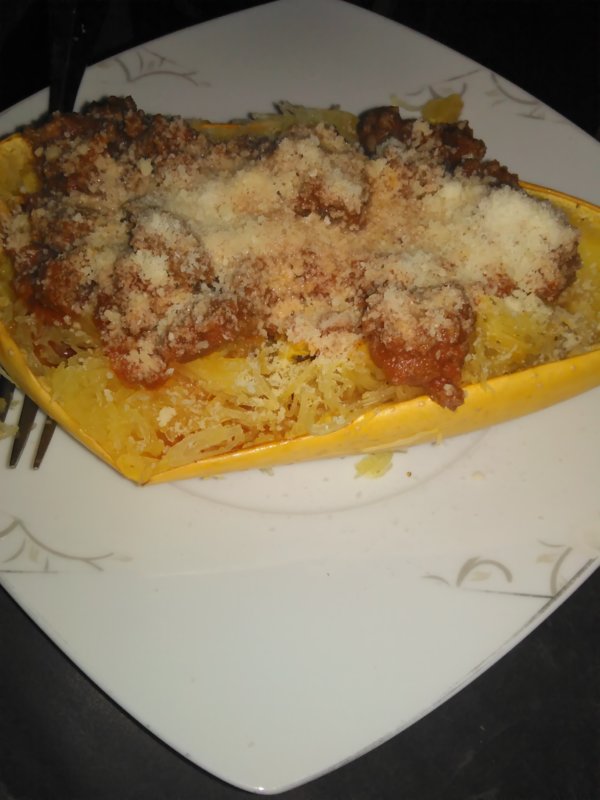 Baked Spaghetti Squash with Meat sauce and a sprinkling of Parmesan cheese.