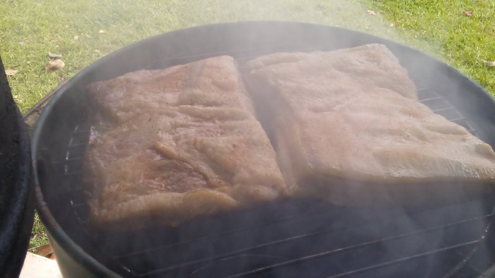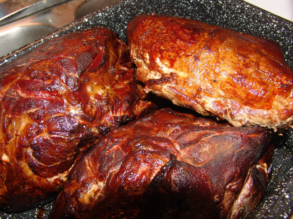 Wet cured several Hams and Bacon slabs for 12 days in light brown sugar,black peppercorn,sea salt,onion powder,clove, ground rosemary, garlic powder and accurate amount of sodium nitrate. Thursday was the smoke-a-thon. I bet you could smell it a mile away. Blackjack Oak & Hickory wood. Started early morning until after midnight. The aroma was unbearable torture. I gained 5 lbs by smelling the farm air all day.